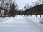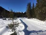 Silný vítr odstavil lanovky a původní plán sjezdovky jsme změnili na běžky. Opět se běhá podél potoka a některé trasy míří i výše. Na výběr modré, červené i černé obtížnosti, všude čerstvě upraveno pro oba styly. V údolí je cca 50 km tratí v nadmořské výšce 1200 - 1550m, jedna černá se ve dvou kilometrech nad mořem kroutí přes hranici na italskou stranu. Jistota sněhu je tady téměř 100%, strach z poškrábání skluznice tady neznají,