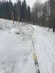 Na Vojenské z Nové Lhoty na Hlavinu dnes připadlo 3 - 20 cm poměrně těžkého sněhu. Náročný byl už jen výjezd ze Lhoty na parkoviště po neupravené silnici, proto někteří běžkaři nazuli běžky už ve vesnici.
