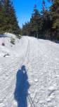 Dnes úžasné (!!!) svezení z Ovčárny na Švýcárnu, stopy projeté rolbou, prašan - nekecám ! Pán z půjčovny v Malé Morávce mi tvrdil, že nahoře není žádný sníh a že běžky už nikdo nepůjčuje, ale stačilo kouknout na bílý Praděd, jak mi mává. Ještě, že jsem neuvěřil. Běžky, boty a hůlky mi půjčili na Ovčárně - Figura, za 350Kč. Na dnešek připadlo, celkově bych tipoval tak 20cm, teplota minus 5 stupňů. Čekal jsem, že se opatrně proběhnu po loukách. Jaké bylo moje překvapení, když kousek za Ovčárnou začaly dvě rolbou projeté stopy a mezi nimi manžestr pro bruslaře (minimálně do odbočky k Pradědu ukázkový). Asi dvakrát jsem objel malinký asfaltový flek, případně stačilo skočit do druhé stopy. Fakt krása, při pohledu na předpověď bych řekl, že to klidně ještě na víkend vydrží, zítra určitě, sobota dost možná taky, pak už bude dost teplo.