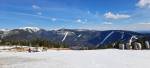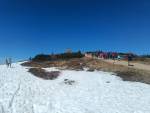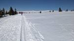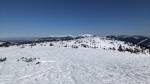 Ve stoupání nahoru na hřeben jsem na první část nejstrmějšího úseku lyže sundal, kvůli pár šutrům i ledu. Dál už na lyžích. Převládají tam skialpinisté a pěší, běžkaři jsou v menšině. Na hřebenech sněhu habaděj. Přímá cesta na Voseckou je už od 15.3. zavřená, probouzí se tam tetřívek. Takže je třeba jet přes cestu na hřebeni (českopolská hranice), tam už mají pěší jasnou převahu, ale vlastně to ani nijak nevadí. I okolo velkých kamenů, kde občas lezou šutry, to ještě bylo sjízdné v pohodě a bezpečně.