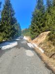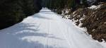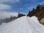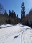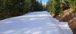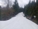 Tahle nádhera (která asi ještě pár dnů vydrží) začíná zhruba u odbočky z Masarykovy silnice na Šmídovou vyhlídku. Nižší úseky silnice se střídá pískovitý firn na slunci s tvrdým podkladem ve stinných úsecích. No a spodní část silnice je už hnůj. Kolem Míseček to během pár dnů sleze na asfalt a bude se muset začínat u odbočky k pensionu U Kotle.