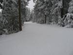 od Abertamské silnice po Šlajsně, kolem Špičáku, přes silnici ke Krmelci, přes Hubertku do DDR a přes Tellerhsuser zpět ke Krmelci, přes Myslivny a po Jáchymovské a Šlajsně zpátky. Vyjeli jsme až po poledni po té největší vánici, 10 cm nového lepivého sněhu. Ten radikálně vylepšil situaci , ale na pár místech, kde je hustší les, číhají kameny. Jestli přes noc upraví (podle mapy už začali), tak bude zítra parádnísvezení.