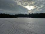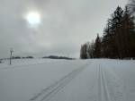 Po deváté hodině už to bylo zmrzlé, i když sněhu moc po oblevě nezbylo. Hodně leze tráva a hlína, ale pořád to ještě vypadá jako v zimě - všude je bílo. U Libenice je prohrnuté obrovské parkoviště na louce, od Libenice až nad Moninec bylo znát, že před pár dny tu projela rolba, a do "vytlačených" zmrzlých stop byla nafoukaná troška nového prašanu. Je to ale vyjeto rolbou jinak než je stopa na zimní mapě - osada Ostrý se neobjíždí z jihu, ale ze severu v trochu větší nadmořské výšce, a nekříží se tedy silnice K poledni začalo zase trochu sněžit, pokud vyjde předpověď počasí a něco v příštích dnech napadne, tak to bude výborné, základ tam všeude je.
