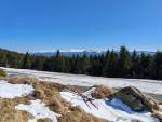 Pěšky ze stadionu, který je až na jeden plácek bez sněhu. Nahoru k Samolotu od první zatáčky sníh, nahoře jsem...
