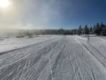 DL teď, teplota těsně nad nulou. Sněhu dostatek, ale je mokrý a těžký. Stopa je dobrá, ale bruslení je mazec. Lyže se zařezává hluboko, je to dřina. Oproti včerejšku 50-ti% zhoršení terénu. Ale včera bylo ráno utaženo rolbou.  Žádné vymrznutí tratě se bohužel nekonalo.