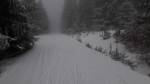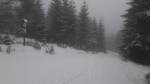 V Bedřichově 0°C, nahoře lehce pod nulou, zataženo, v nejvyšších partiích mlha, tu a tam lehké sněžení. Po celé trase po včerejšku a noci trochu nasněženo, nahoře až 3 cm.