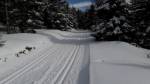 Vše upraveno, stopy rychlé, pevné, vymrzlé, ideální na soupaž. Jen pár špinavějších míst s jehličím v lesních úsecích.